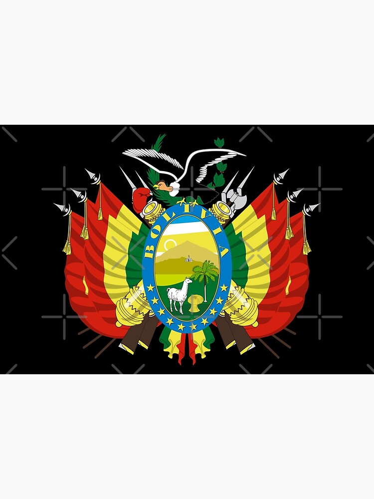 The coat of arms of Bolivia has a central cartouche surrounded by Bolivian flags, cannons, laurel branches, and has an Andean condor on top.